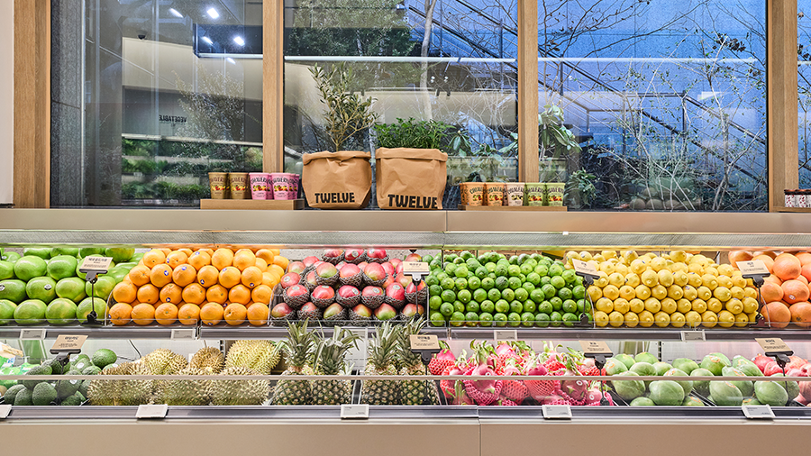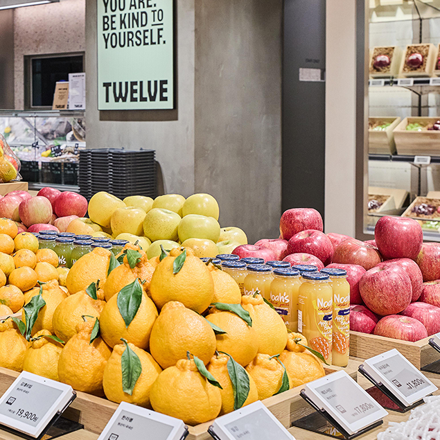 트웰브는 일반적인 식품관과 달리 식품, 리빙, 다이닝, 패션 요소를 아우르는 공간으로 구성됐다. 디스플레이 방식도 패션 편집숍의 문법을 적용해 과일과 채소 등 식재료를 마치 하나의 오브제처럼 연출했다고.