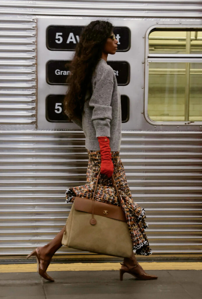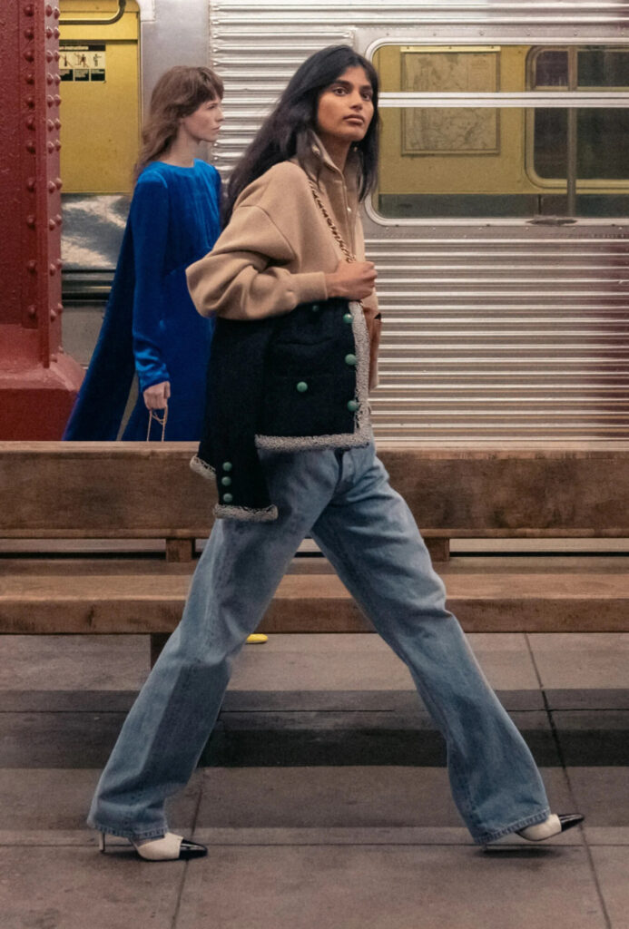 쇼의 오프닝은 언제나 디자이너의 선언에 가깝다. 샤넬 쇼의 오프닝을 담당한 최초의 인도계 모델, 바비타 만다바Bhavitha Mandava는 특정한 뮤즈라기보다, 도시의 흐름 속 한 인물처럼 등장한다. 만다바는 뉴욕에서 학업과 모델 일을 병행하는 인물로, 지하철에서 ’28 Models’의 스카우터에게 캐스팅된 바 있는 그녀의 개인적인 배경이 컬렉션의 뉴욕의 지하철이라는 공간과 정확히 오버랩된다. 과장된 제스처도, 극적인 연출도 없다. 대신 자연스럽고 단단한 워킹을 통해 이 컬렉션의 태도를 압축한다. 오프닝 룩 자체도 그 서사를 강화하는 방향으로 구성됐다. 그녀가 입은 일상적인 스타일의 문법(화이트 티셔츠, 쿼터 집업 스웨터, 데님 팬츠, 스웨이드 백)으로 요약되며, ‘평범한 하루의 지하철 승객’처럼 보이는 감각을 의도적으로 살렸다.