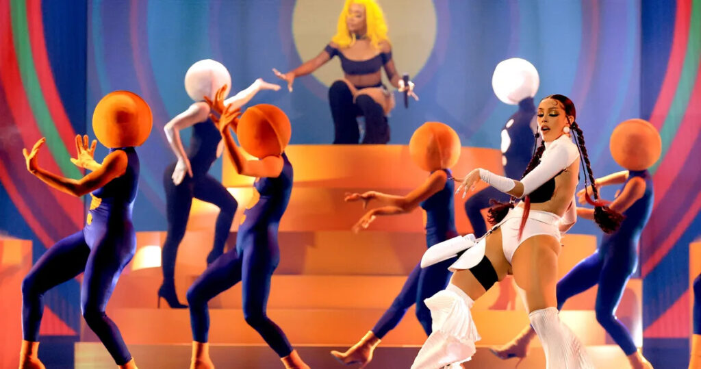 예를 들어 2021년 iHeartRadio 뮤직 어워드에서 컨트리풍으로 편곡한 ‘Say So’와 ‘Kiss Me More’을 선보이며 옥수수밭에 떨어진 소녀로 분했으며, 2023 MTV 비디오 뮤직 어워드에서는 붉은 칠을 한 댄서들 사이에서 이질적인 포멀한 룩으로 등장하더니 무대 의상과 머리를 풀어헤치고 댄서들과 동화되는 듯한 연출을 선보였다.