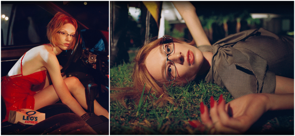 국내 브랜드의 경우, 젠틀 몬스터가 가장 앞선에서 이러한 현재적 경향을 이끌고 있다. 2025년 가을 컬렉션을 위한 것으로, 배우 헌터 샤퍼Hunter schafer가 출연하고 독창적 시각 언어로 알려진 영화감독이자 사진가인 나디아 리 코헨Nadia lee cohen이 연출했다. 이들이 제작한 <더 헌트THE HUNT>는 아이웨어 캠페인을 기존에 브랜드가 다루기 어려워했던 호러 장르로 재구성해 장르적인 도발을 시도하며 단편 영화에 가까운 구조를 완성한다. <더 헌트>는 일상적인 장면에서 불협화음, 복제된 인물들이 등장하는 장면들로 전환하며 호러 장르의 코드이면서 동시에 젠틀몬스터가 오랫동안 구축해온 비현실적이며 기이한 브랜드 미감과 정확히 맞물린다. 이 캠페인에서 제품인 ‘심플라인Simple Line‘ 아이웨어는 화면에서 주연처럼 부각되지 않는다. 대신 주인공이 경험하는 감정의 굴절, 세계의 불온함, 그리고 서사의 긴장을 공감각적으로 조직하는 요소로 기능한다.