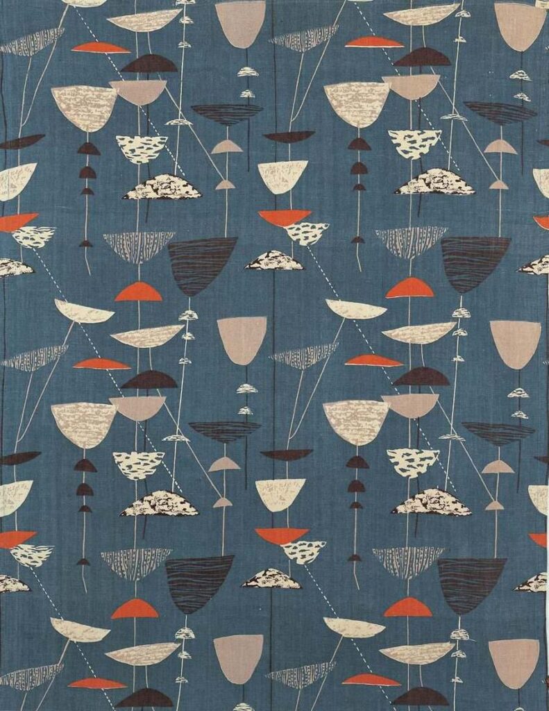 1950년대 초, 루시엔 데이는 전후의 피로감이 짙게 깔린 영국의 풍경 속에 생소한 색과 움직임을 불어넣었다. 산업화의 질서가 지배하던 잿빛 일상에서 그녀는 직물이라는 캔버스 위에 살아 있는 자연의 형태를 그려 넣었다. 그녀의 대표작인 <Calyx>는 그 정점에 있다. 식물의 꽃받침에서 영감을 얻은 이 패턴은 단순히 장식적인 요소를 넘어, 전후 영국 사회가 갈구하던 ‘회복’과 ‘성장’의 상징이었다.