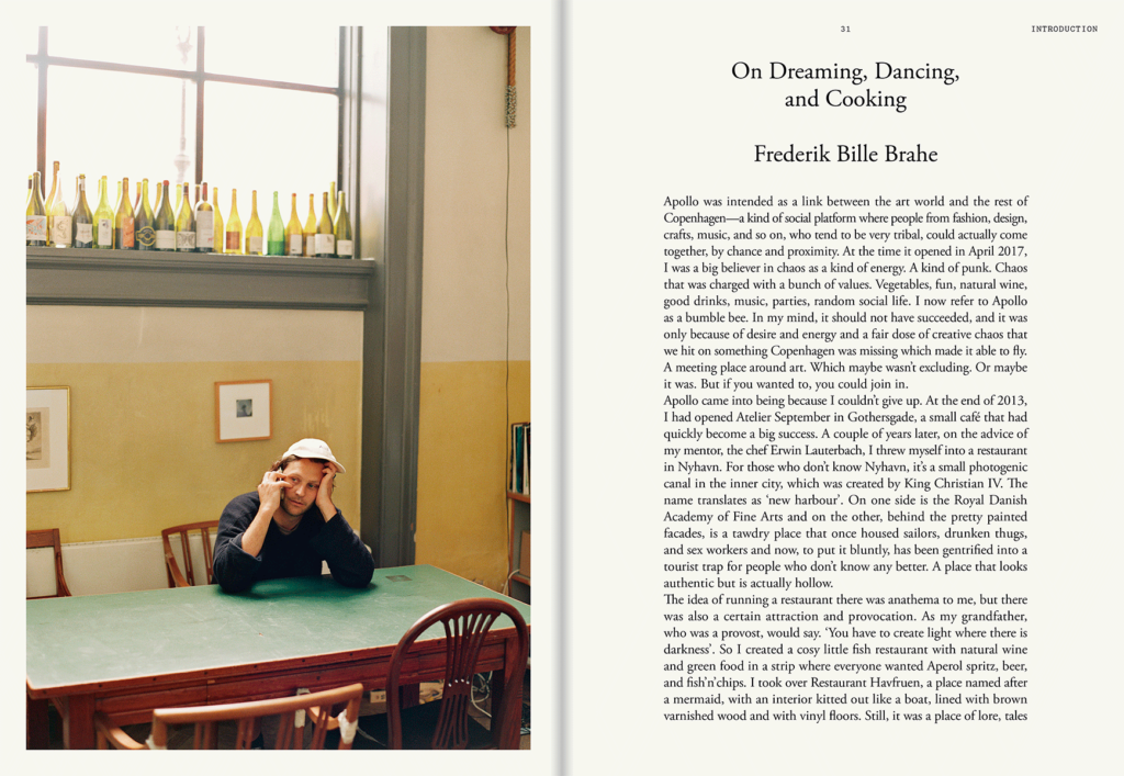 이번 신간 <Apollo : State of the cooking and a party>은 코펜하겐의 유서 깊은 미술관 쿤스트할 샬로텐보르Kunsthal Charlottenborg 안뜰에 위치한 그의 레스토랑 ‘아폴로Apollo‘를 주제로 한 첫번째 요리책이다. 수석 셰프 유타 쿠라하시Yuta Kurahashi와 함께 아폴로만의 메뉴 104가지 레시피를 담았다.