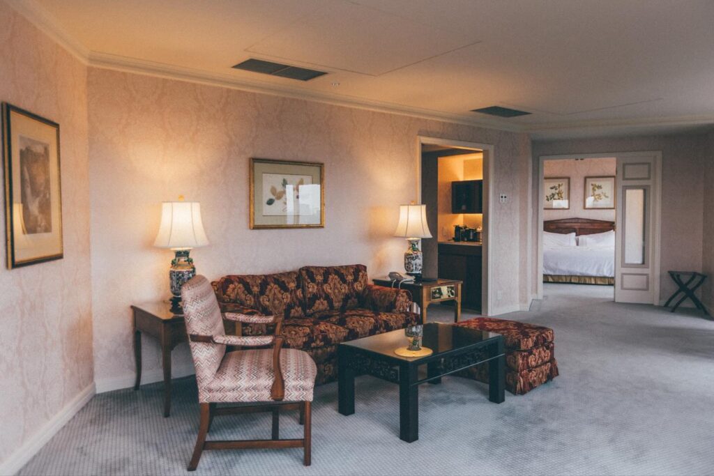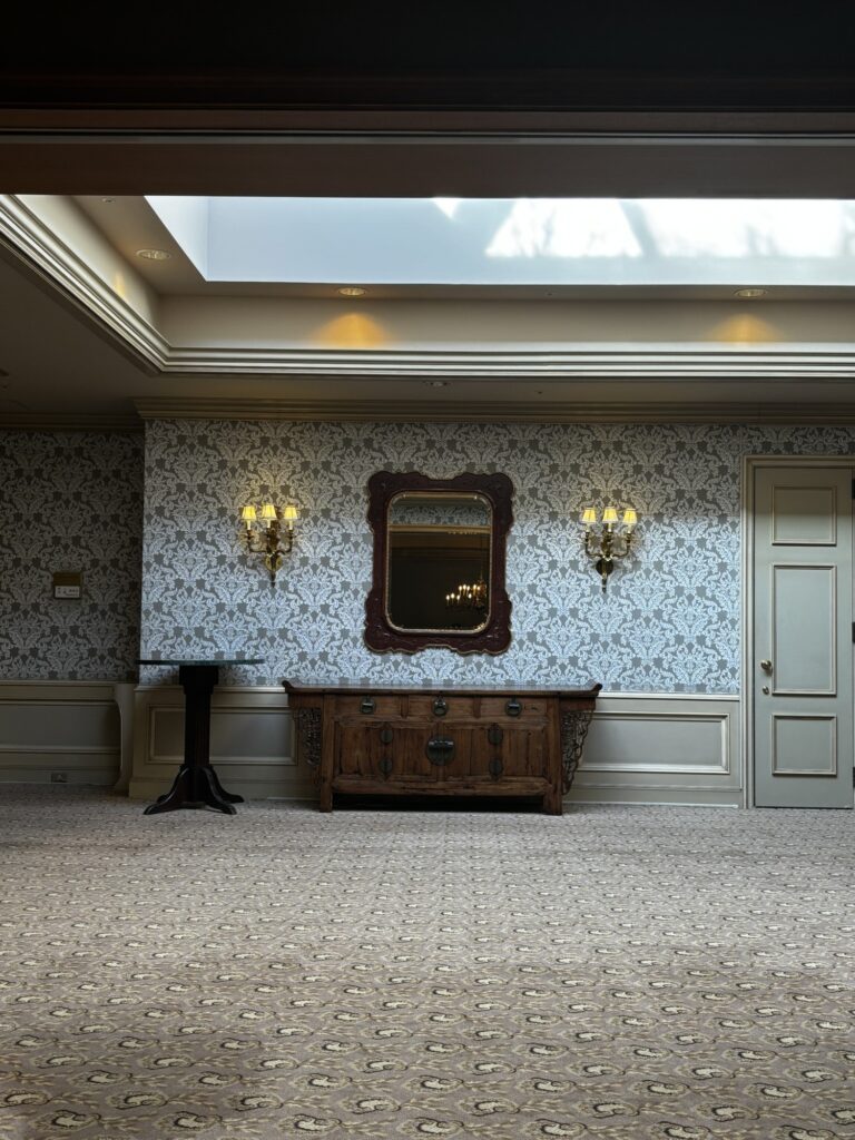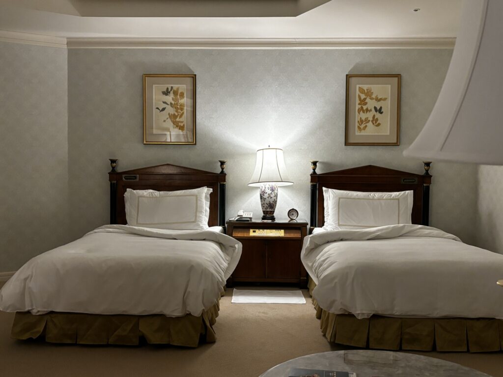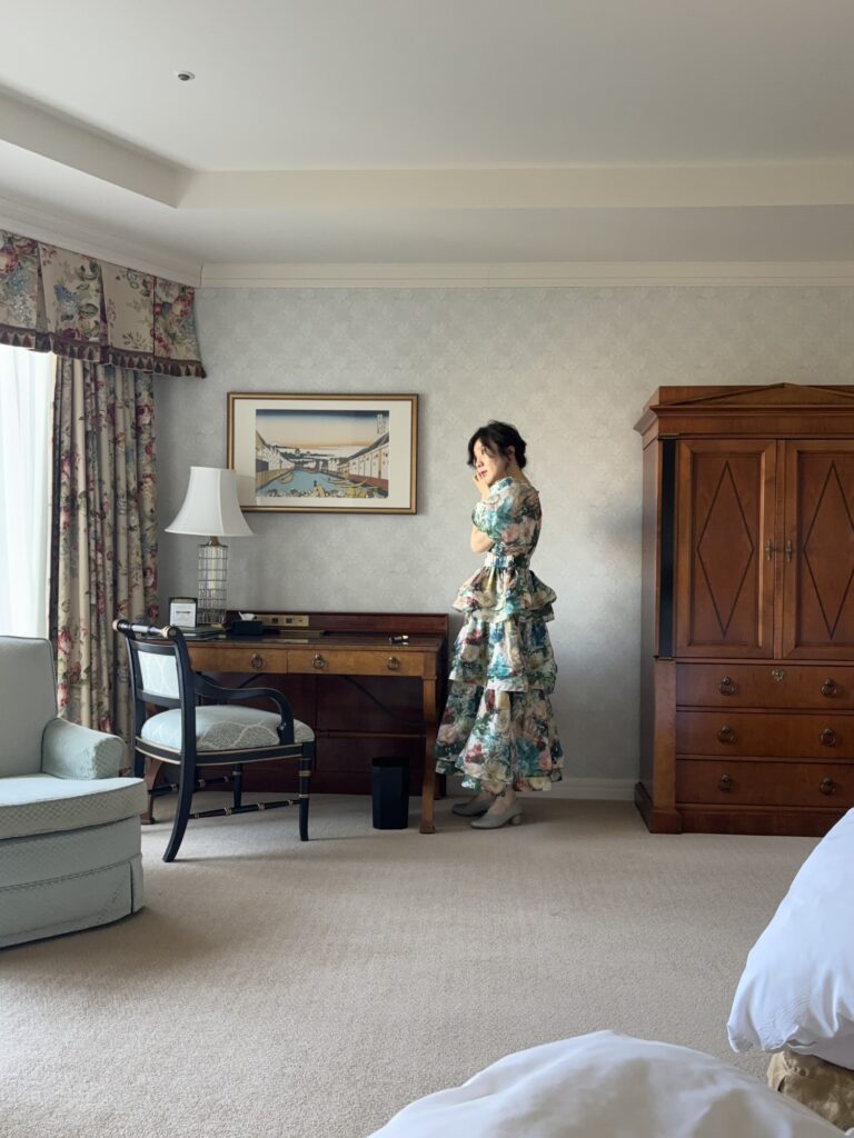 627호, 디럭스 트윈 가든뷰 룸에 들어섰다. 베이지빛 카펫이 깔린 객실은 전형적인 사각형이 아닌 각이 독특한 사다리꼴이다. 연극적으로 놓여 있는 두 개의 민트색 암체어, TV와 미니바를 숨긴 높다란 마호가니 캐비닛, 유려한 곡선 다리를 가진 네오클래식 풍의 책상까지. 최근의 호텔에서는 찾아보기 힘든 클래식 가구들의 절묘한 배치다. 오래된 호텔 가구에서만 느껴지는 단정한 곡선과 짙은 나무의 질감이 서로 겹치며 공간의 깊이를 만든다. 꽃무늬가 요동치는 커튼은 장미와 덩굴패턴을 따라 늘어지며 화려한 터치를 더한다.