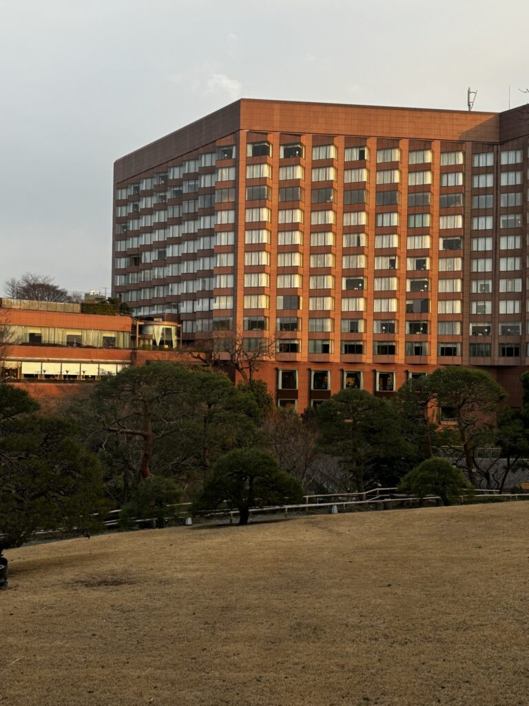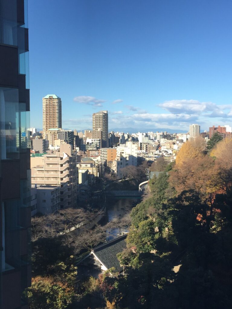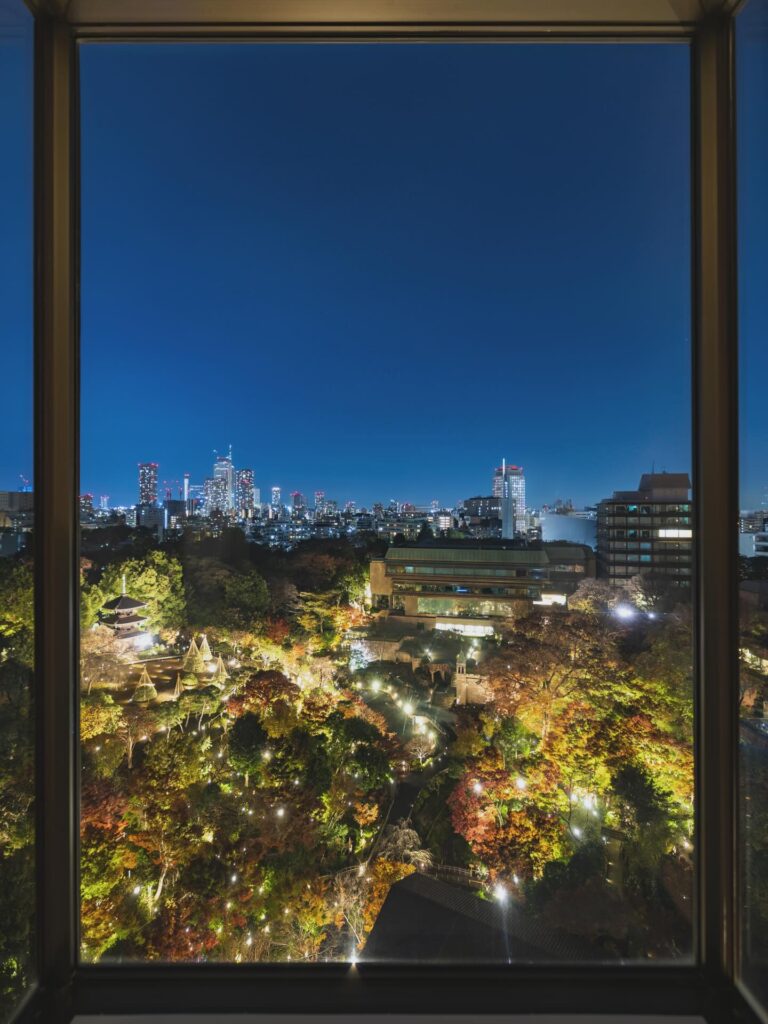 걸음을 절로 이끄는 정면의 통창 밖으로 시선을 사로잡는 풍경이 펼쳐졌다. 도쿄의 도심이라고는 믿을 수 없는 광활한 자연이 호텔 뒤편에 숨어있는 것이었다. 누그러진 초록과 겨울 녘의 붉은 잎들 사이로 짙은 침엽수가 윤곽을 그리고 그 뒤로는 깊이를 알 수 없는 숲의 그림자가 누워있다. 언덕 지형을 가진 숲이라는 표현이 더 어울릴 듯하다. 친잔소의 백미는 호텔 내에 이 고즈넉한 정원을 품고 있다는 사실이다.
