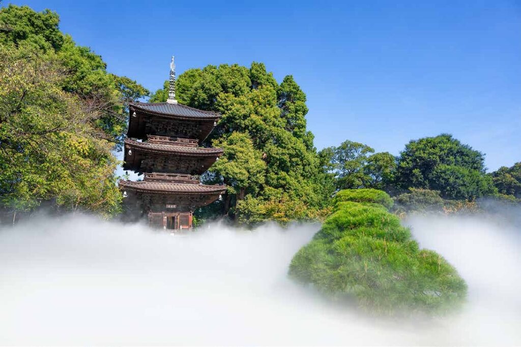 친잔소의 전 객실과 정원을 모두 아우르는 즐거운 경험 하나가 더 있다. 시간마다 두 번씩 정원을 수증기로 가득 채우는 ‘도쿄 씨 오브 클라우즈Tokyo Sea of Clouds’가 그것이다. 서서히 피어오르는 인공 안개 속에서 목조탑과 연못, 나무들이 아스라히 사라졌다가 다시 모습을 드러낸다. 안개 속에서 잠시 사라지는 자신을 느끼는 몇 분간, 키 큰 나무가 뻗은 가지, 폭포, 천년된 목조탑의 선들이 모호하게 연결되며 하나의 거대한 수묵화가 펼쳐진다. 밤 10시 10분이 되면 마지막 클라우드를 보기 위해 투숙객들과 레스토랑 손님들이 언덕 아래로 모인다. 천천히 안개가 차오르면서 수 천개의 불빛 씨앗들만이 별처럼 빛난다. 터져 나오는 작은 탄성마저도 고요 속에 스며든다. 정원에서 보는 것도 장관이지만, 객실에서 내려다보는 클라우즈는 자연이 흘러가는 형국처럼 스펙터클하다. 스위스 실스마리아의 산맥을 굽이굽이 흘러가는 말로야 스네이크 구름처럼.