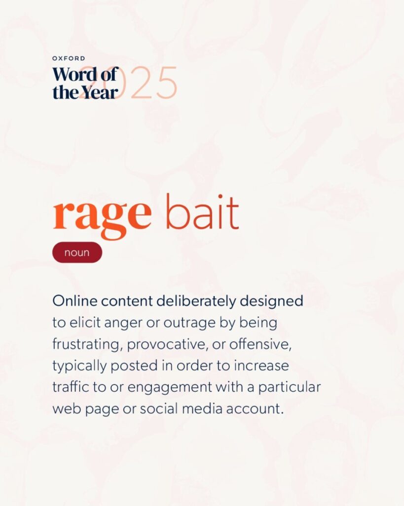 옥스퍼드 사전을 발행하는 옥스퍼드대학교 출판부는 올해의 단어로 ‘레이지 베이트rage bait’를 선정했다. ‘분노rage’와 미끼bait’의 합성어로, 온라인에서 이용자의 참여를 늘리기 위해 분노를 자극하는 콘텐츠를 가리키는 말이다. 낚시하듯 클릭을 유도하는 ‘클릭 베이트click bait’와 비슷하지만, 보다 구체적으로 ‘분노’에 초점을 둔 것이 특징이다.
