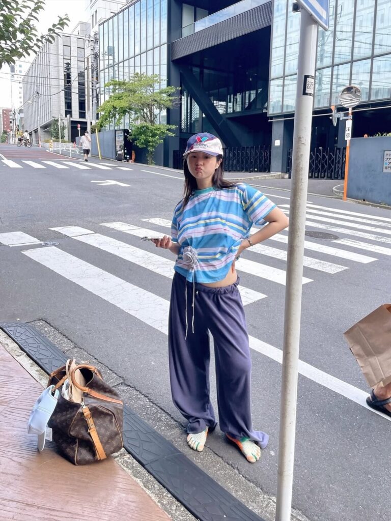 (오) 네이비 컬러의 볼캡과 베스트, 핑크색 팬츠를 매치한 강민경 Ⓒ강민경