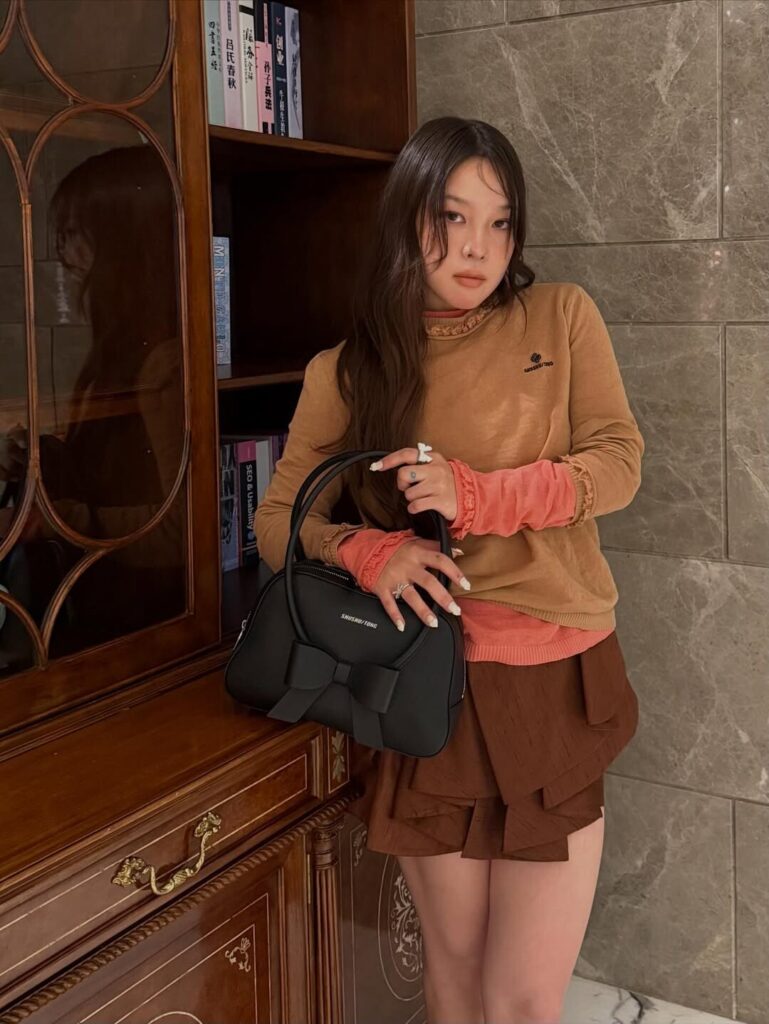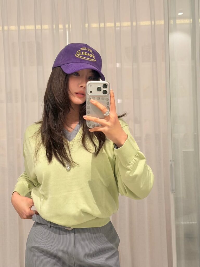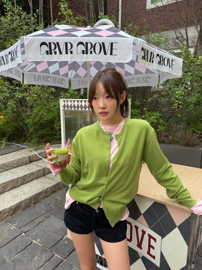 (오) 말차 컬러 카디건에 라이트 핑크의 이너로 스타일링한 인플루언서 잉화 Ⓒ잉화