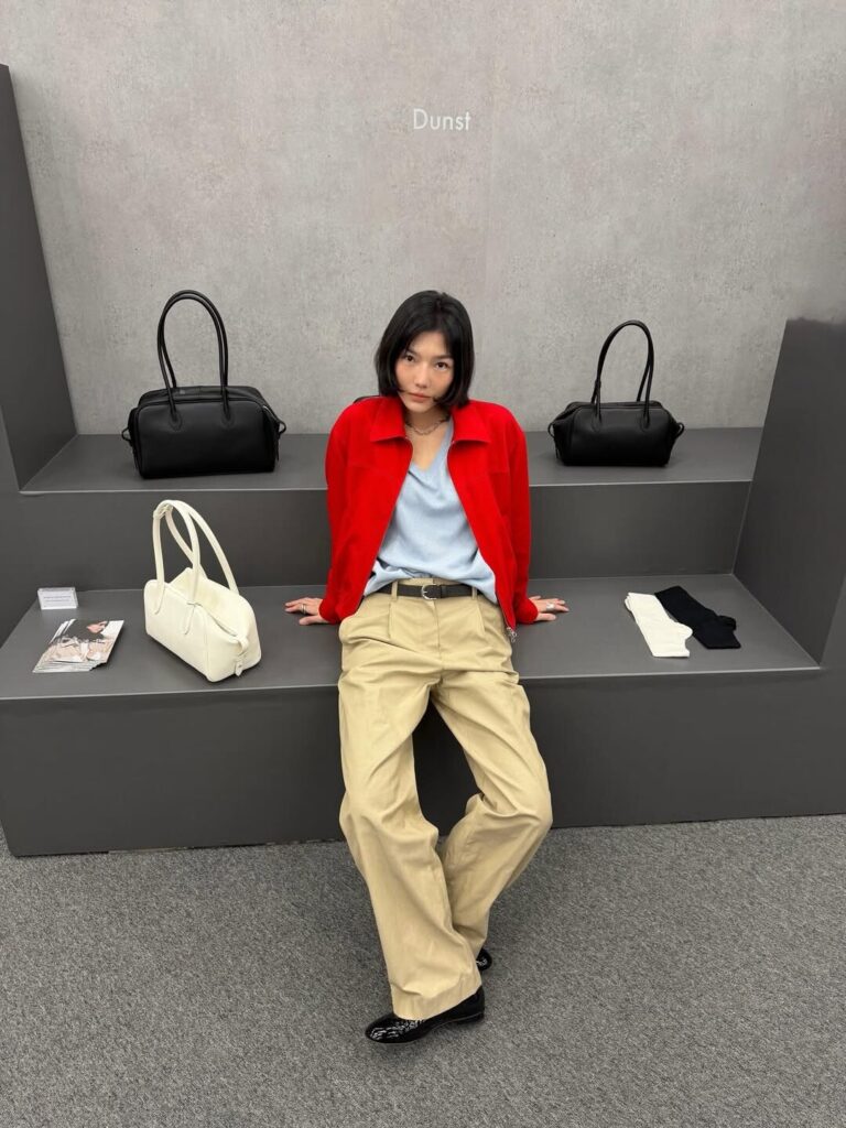 (오) 옅은 색의 이너, 팬츠와 함께 강렬한 레드 재킷을 강조한 인플루언서 현주파크 Ⓒ현주파크