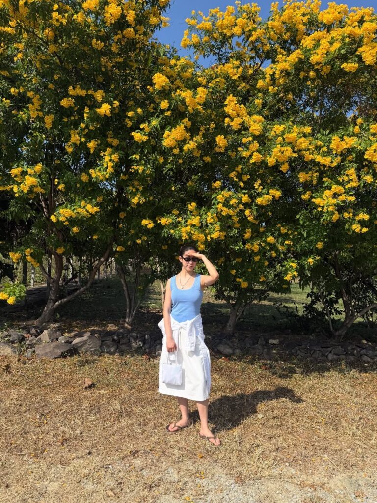(오) 소재에 변주를 주면서 베이지, 오렌지, 핑크 컬러 매치한 인플루언서 수사샤 Ⓒ수사샤