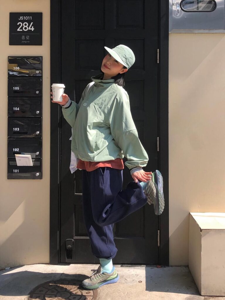 (오) 채도가 낮은 민트 컬러를 중심으로 스포티 룩을 완성한 패션 디자이너 강인선 Ⓒ강인선