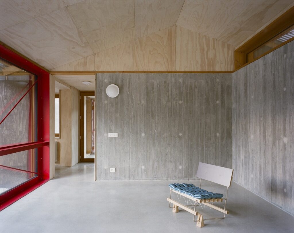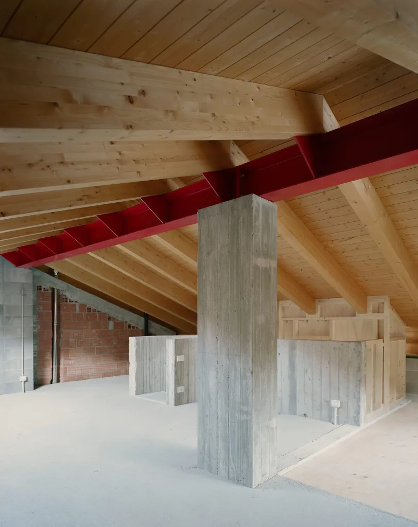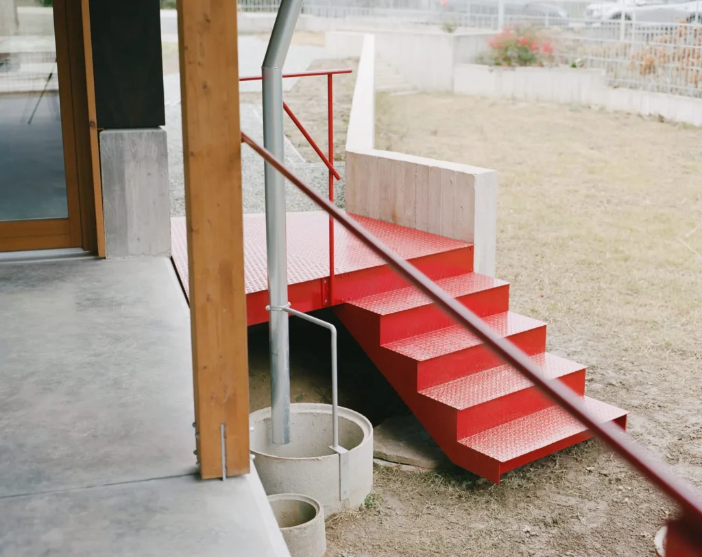 난간과 배수관, 지붕을 받치는 구조물, 도로 쪽 울타리, 기존 건물의 용마루보에 이르기까지. 평범해 보일 수 있는 요소들 역시 세심하게 디자인되어 공간의 일부로 작동한다. BM House의 내부는 일상적인 재료와 구조 속에서 새로운 가능성을 발견하며, ‘집’이라는 공간을 보다 살아 있는 환경으로 확장한다. 정원과 실내 곳곳에 배치된 철근 콘크리트 벽과 레드 컬러 포인트는 실내와 실외를 연결하는 장치로 기능한다. 남향으로 배치된 대형 목재 골조는 풍경을 일상으로 끌어들이는 동시에 외부 노출을 조절한다.