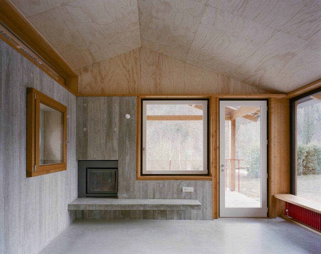 기존 건물과 신축 파빌리온을 잇는 깔때기 형태의 합판 공간은 현관과 서재, 벽난로가 있는 거실을 품고 있다. 거실은 경사면 위로 뻗은 지붕이 있는 테라스로 이어지고, 모든 층에서는 구조화된 공간의 가장자리를 따라 벤치와 카운터, 휴식과 사색을 위한 장소들이 자연스럽게 배치된다. 햇볕이 드는 곳과 그늘진 곳이 공존하는 집이다.