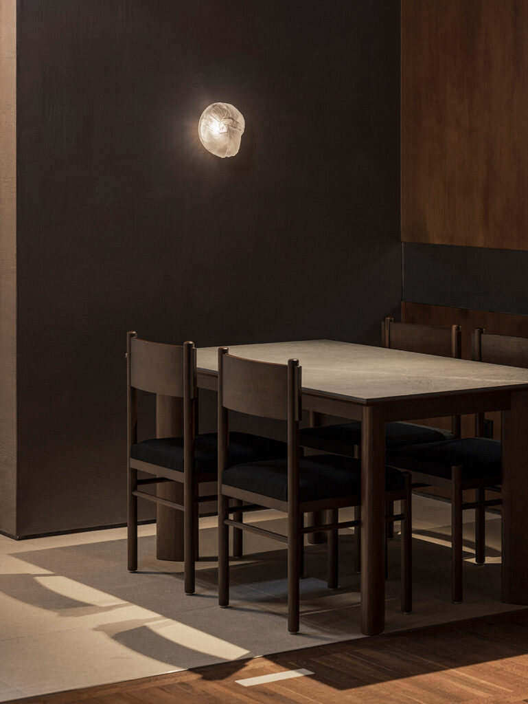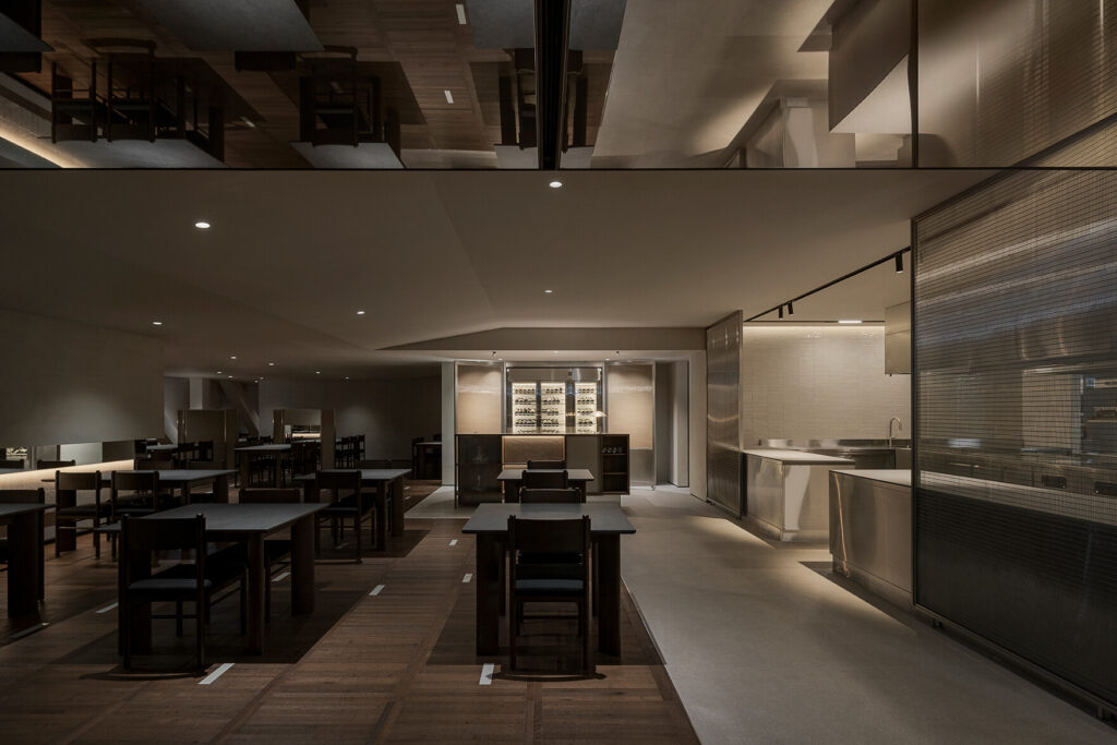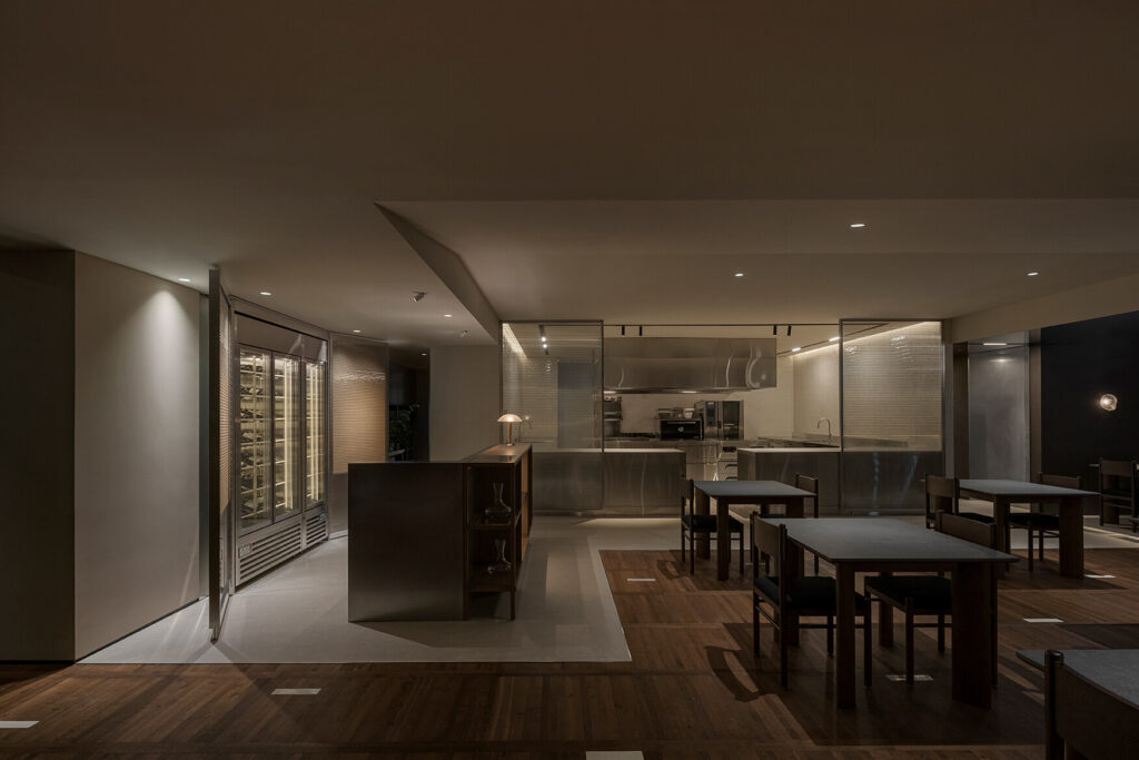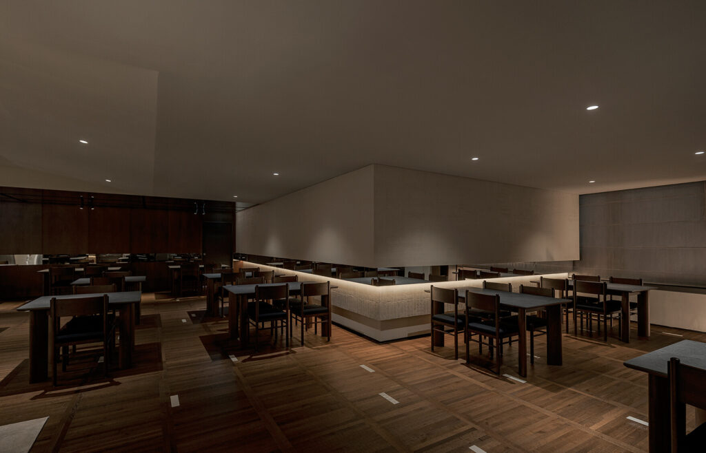 공간은 광화문 그랑서울이 가진 구조적 제약을 새롭게 재해석하는 데에서 출발했다. 제한된 주방 설비와 낮은 층고라는 제약을 경험의 흐름으로 전환시킨 것. 진입부 동선을 꺾어 좁고 긴 복도를 통과하도록 설계했으며, 낮게 눌린 시선은 내부에서 점차 확장된다. 이러한 구성은 한국의 전통 건축에서 나타나는 공간의 대비를 연상시키며, 경사진 천장은 처마의 이미지를 은유적으로 반영한다.