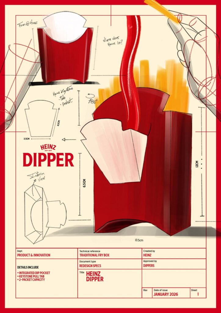 하인즈는 “왜 처음부터 이렇게 디자인되지 않았을까요? 하인즈 없는 감자튀김은 상상할 수 없죠. 그래서 우리가 해결했습니다.”라는 문구와 함께 제품 디자인을 공개했다. 크래프트 하인즈 컴퍼니Kraft Heinz Company의 글로벌 하인즈 브랜드 부사장 니나 파텔Nina Patel은 “감자튀김 박스와 하인즈의 아이코닉한 키스톤Keystone 로고 사이의 유사성을 전 세계적으로 조명한 뒤, 한 단계 더 나아가고자 했다. 오래된 감자튀김 박스를 새롭게 설계해 소비자들을 위해 ‘더 열심히 일하는’ 패키지를 개발했다. 하인즈 디퍼는 일상 속에서 하인즈의 역할을 강화하는 유쾌하고 적절한 혁신이다.”라고 덧붙였다.