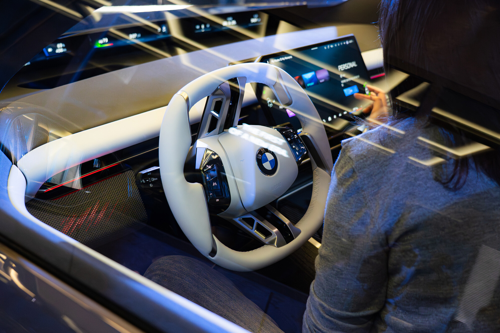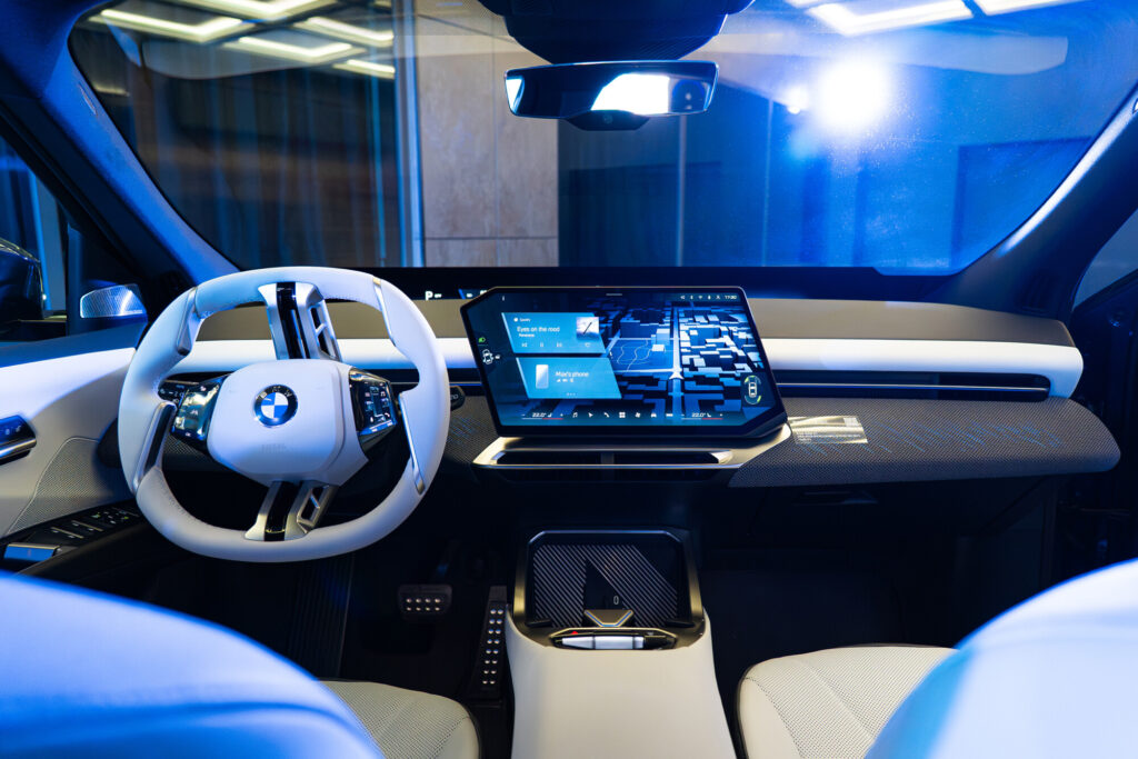 공중에 떠 있는 것처럼 보이는 대시보드 패널은 도어트림으로 자연스럽게 이어져 마치 승객을 감싸는 듯한 감각을 전달한다. 대시보드 중앙에 있는 대형 디스플레이는 상단을 운전석 쪽으로 기울여 BMW 특유의 운전자 중심 구조를 완성했다.