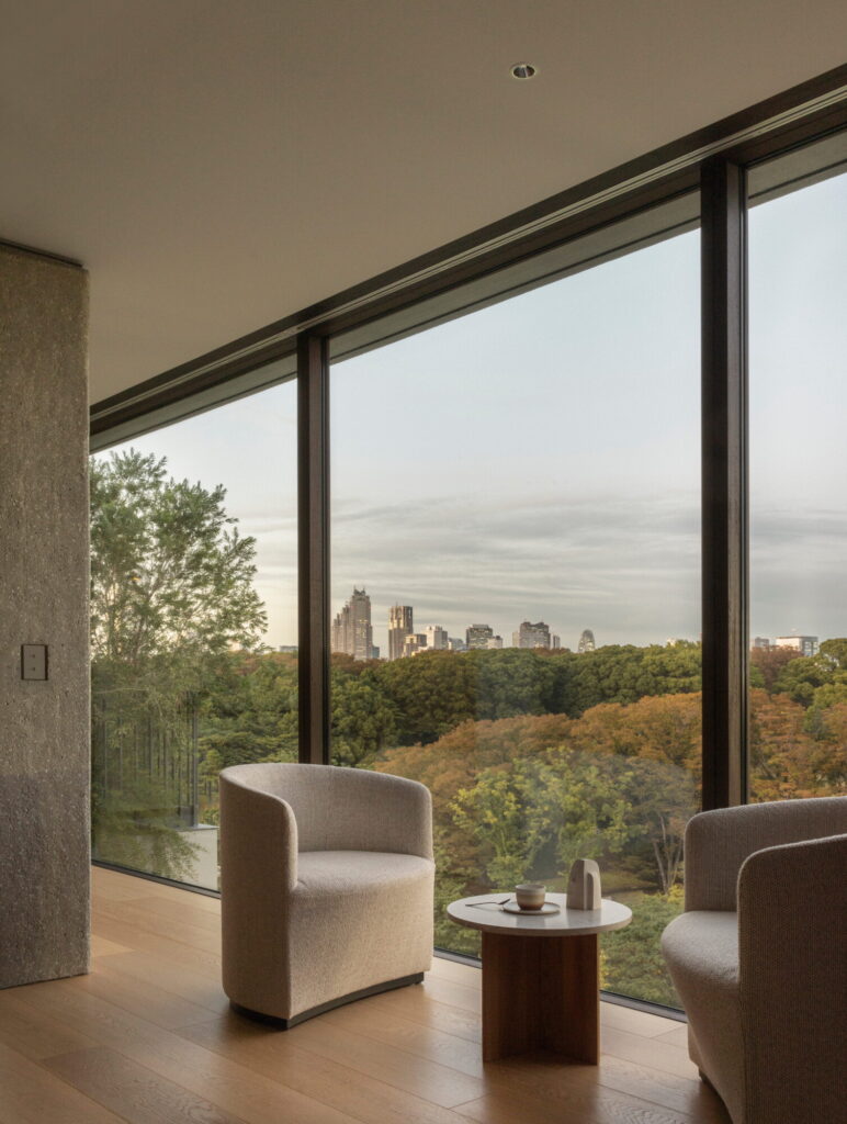 2023년 문을 연 트렁크 요요기 파크의 건축과 인테리어는 도쿄 기반의 게이지 아시자와Keiji Ashizawa Design와 덴마크의 놈 아키텍츠Norm Architects의 결합으로 도쿄적 감성과 소프트 미니멀리즘이 어우러진다. 거친 콘크리트 표면을 드러낸 박스형 건물에 25개의 객실이 자리하고, 외벽 테라스가 자연스럽게 모듈을 만들어내 리듬감을 자아낸다.