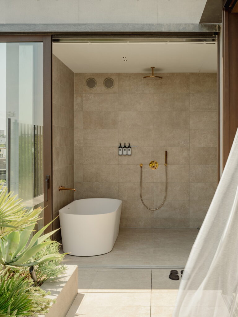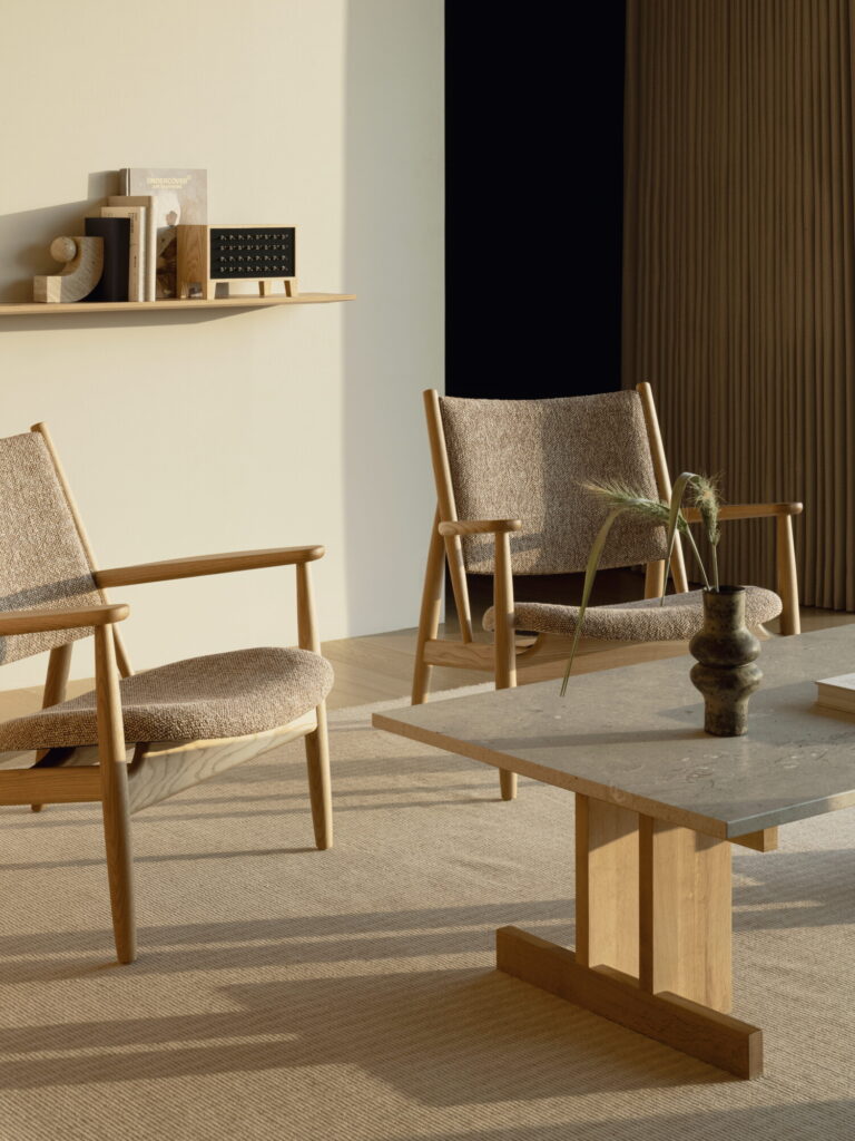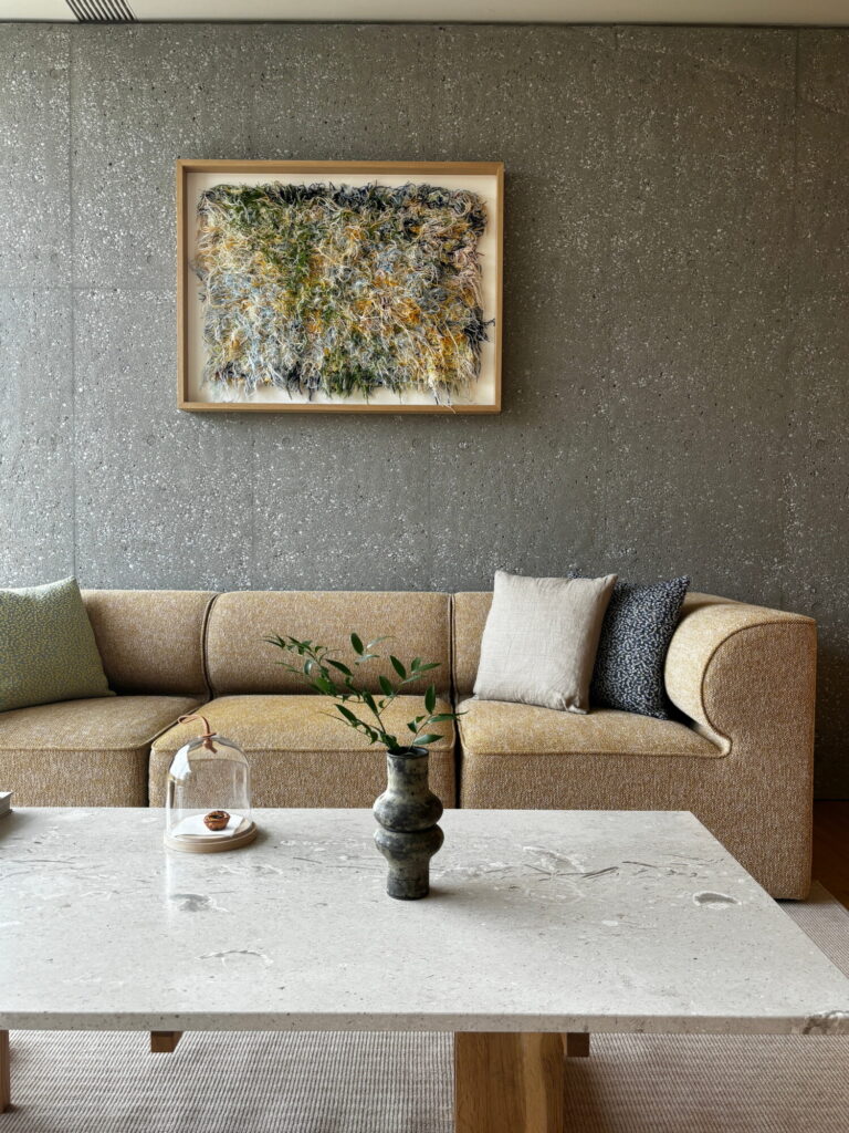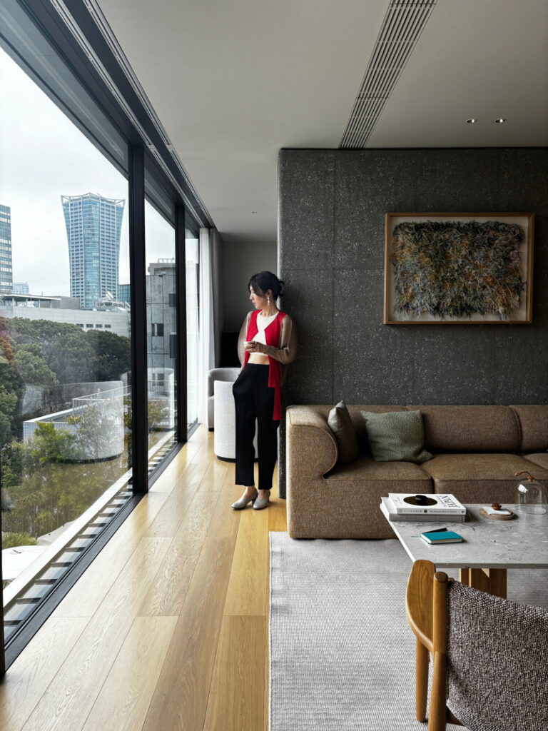 묵고 있는 오너 스위트 룸은 건물 꼭대기 층을 모두 쓰는 펜트하우스형 객실이다. 밝은 오크 벽으로 침실과 거실을 구획하고, 기다란 욕실은 발코니로 향해있는 커다란 욕조와 나부끼는 화이트 커튼으로 마무리된다. 복숭아색 크바드라Kvadrat로 감싼 아우도Audo의 이브Eeve 모듈러 소파, 아리아케Ariake 라운지체어는 덴마크에서 몰고 온 놈 아키텍츠의 따듯한 질감을 표현한다. 스칸디나비아의 차분한 선과 일본식 미감은 이케바나처럼 여백을 남긴 채, 서로를 침범하지 않는다.