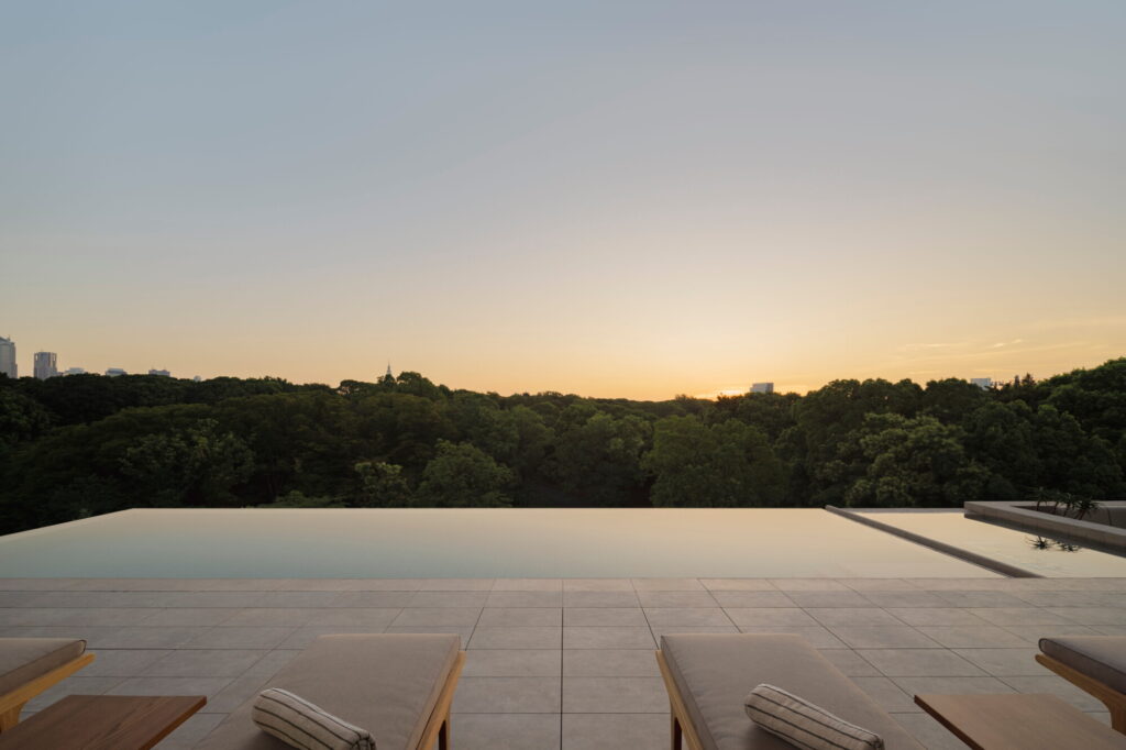스위트룸 게스트에게만 허용된 계단의 비밀 문을 슬며시 밀어 연다. ‘Take Me Home’이라고 적힌 플립플롭에 얇은 가운만 걸쳐 입고 내려간 곳은 호텔의 핵심인 트렁크 풀 클럽. 야외의 환상적인 인피니티 풀이 하늘 아래 수면을 드러낸다. 이른 아침이지만 몇 명의 투숙객이 이 보기 힘든 도쿄의 설경을 보러 물속에 몸을 담그고 있다. 모두 시선을 저만치 멀리 두고 각자의 고요 속에 머문다. 요요기 공원의 끝없는 수목이 이상적인 높이에서 수평으로 펼쳐진다. 그새 눈은 그쳤지만, 쌓인 눈이 아직 나무 끝에 남아있다. 물속으로 스르르 미끄러져 들어갔다. 시야를 가리는 난간이나 스크린 없이 오롯이 도쿄의 공기를 대면할 수 있는 풀이라니! 따듯한 물의 촉감, 코로 들어간 청량한 2월의 공기가 온몸을 관통한다. 이 순간만큼은 여행도, 일상도 아닌 채로 그저 ‘머무는 중’이다. 커다란 쪽빛 스위밍 풀과 따스한 거품이 일렁이는 자쿠지, 둘 중 어디서든 고개를 찬찬히 돌리면 요요기 공원과 그 너머의 스카이라인이 한 편의 파노라마로 열린다.