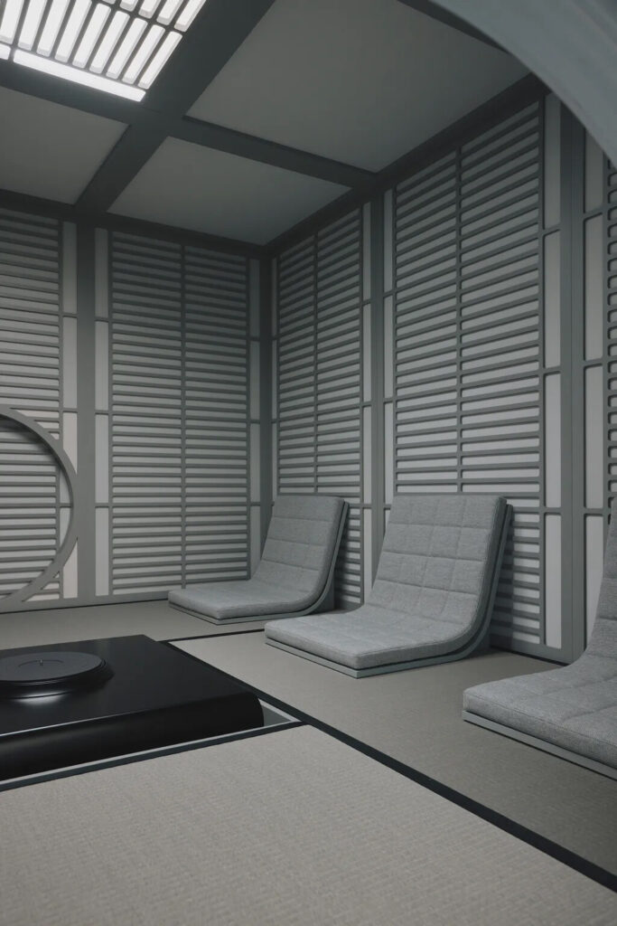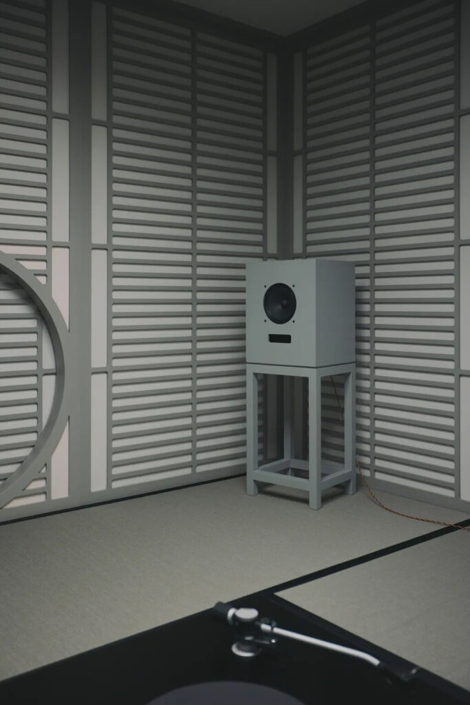 턴불은 음악 감상에 몰입할 수 있는 공간인 ‘리스닝 하우스Listening House’ 시리즈를 작업해 왔는데, 이번에는 일본의 전통 다실茶室에서 영감을 받은 ‘사운드 하우스Sound House’를 공개했다. 그는 이번 전시를 위해 카리모쿠와 긴밀한 협업을 통해 의자 디자인에도 직접 참여하는 등 공간을 채울 가구와 스피커 모두 새롭게 제작했다. 보통 금속으로 제작되는 대형 혼Horn 스피커와 달리 온전히 목재로 제작되어, 나무의 결을 타고 흐르는 소리가 특별한 청각적 경험을 제공한다. 산조Sanjo, 로쿠조Rokujo, 누리카베Nurikabe 세 가지 크기로 제작된 스피커는 턴불의 시그니처 색상인 퓨터 그레이Pewter Grey 와 내추럴 오크Natural Oak 두 가지 색상으로 구성됐다.