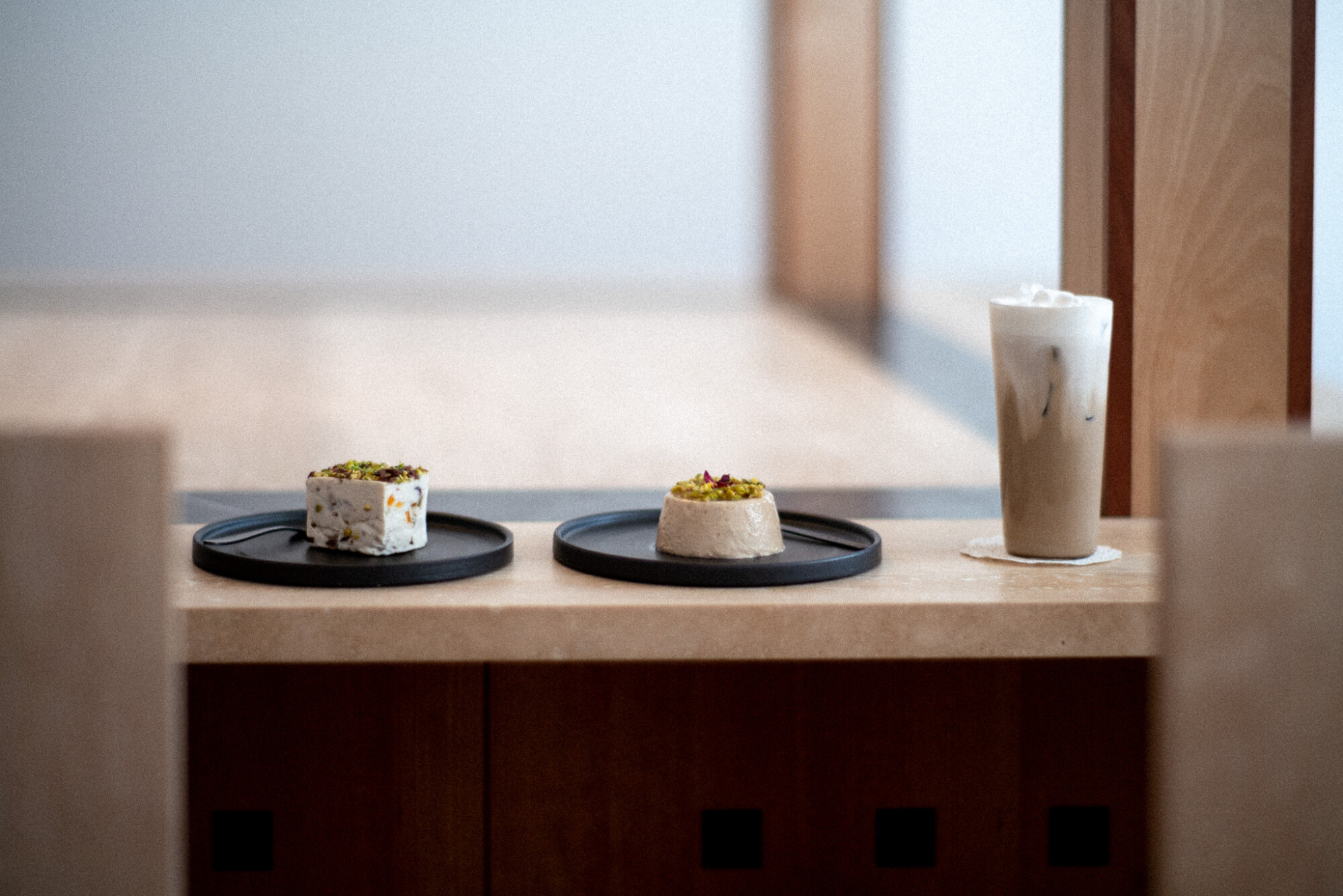 오후 2시에서 4시 사이, 옆 건물에서 반사된 빛이 실내로 들어오는 순간이 있어요. 천장과 벽면이 모두 하얀색이라 빛이 부드럽게 퍼지는데, 그 시간이 가장 좋습니다. 이때는 오쿠미도리 말차 라떼나 따뜻한 카카오 스파이스 짜이를 권하고 싶어요.