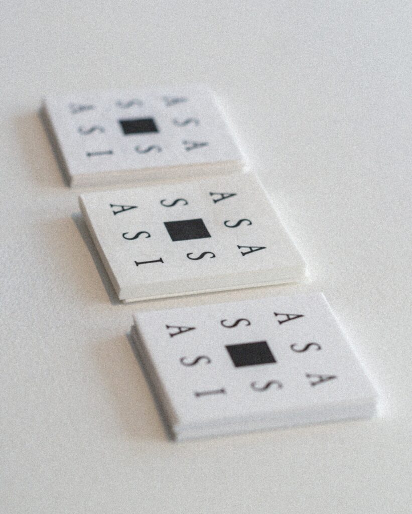 배재희 디렉터와 고혁준 디자이너는 오랜 시간 호흡을 맞춰온 파트너다. 언젠가 꿈에서 스친 단어 ‘아사시’를 현실의 형상으로 구체화하는 과정 역시, 두 사람의 긴밀한 대화 속에서 완성됐다. 브랜드를 준비하던 시기, ‘만들어지고 있는 상태’ 자체에 주목하던 태도는 하나의 이미지로 이어졌다. 사그라다 파밀리아의 ‘수난의 파사드(Passion Facade)’에 새겨진 마방진처럼, 숫자를 드러내지 않으면서도 의미를 함축하는 구조. 여기에 아르데코 가구에서 발견한 ‘흑단의 사각형’이라는 조형 언어가 더해졌다. 아홉 개의 검은 사각형 아사시 로고는 그렇게 완성됐다.