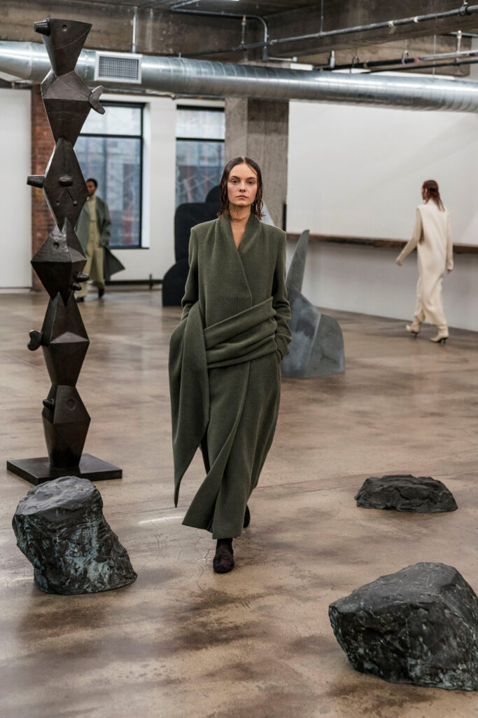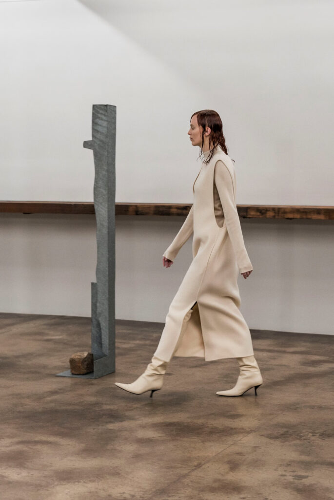 이러한 미에 대한 관점은 2018년 뉴욕 패션위크 기간 중 이사무 노구치 뮤지엄에서 열린 더 로우의 쇼에서 절정을 이룬다. 모델들은 2.5m 높이의 청동 조각 〈Bird Song〉을 비롯한 노구치의 조각 13점 사이를 조용히 걸어갔다. 애슐리 올슨은 이에 대해 “노구치의 조각에서 본 것을 우리의 디자인에 풀어냈다”고 밝혔는데, 이는 선과 면으로 이루어져 표면의 질감이 부각될 수밖에 없는 조각의 특성을 의복으로 치환해 낸 순간이었다. 펜이 옷을 기하학적 형태로 바라보며 조각처럼 사진을 찍었듯, 더 로우 역시 의복이 조각의 표면을 닮아가도록 연출한 셈이다.