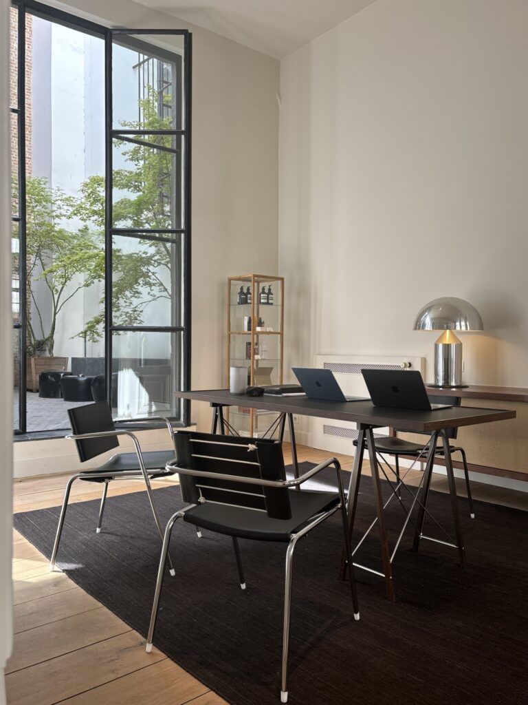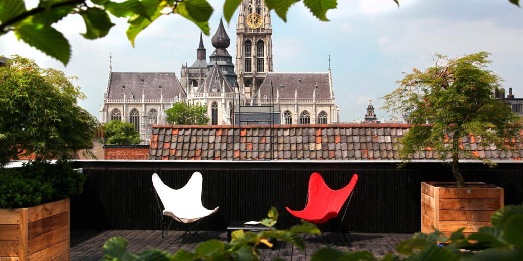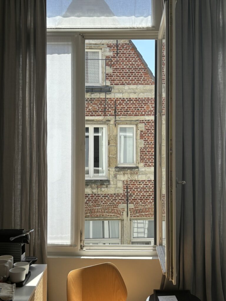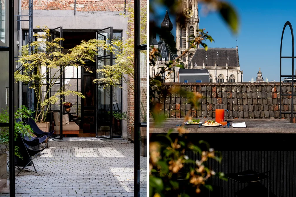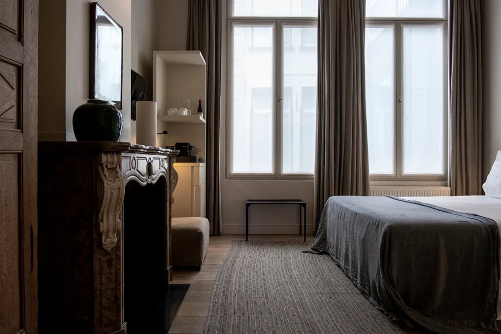 1872년 작 <플랜더스의 개>에서 네로와 파트라슈가 나란히 마지막을 맞이한 곳, 루벤스의 <십자가에서 내려지는 그리스도>가 여전히 걸려있는 성모마리아 성당. 그로엔 광장의 활기를 살짝 비켜선 좁은 골목에 호텔 줄리앙이 자리한다. 벨을 눌러야만 열리는 문을 밀고 들어서자, 오랫동안 마음에 품고 있던 장소에 도착했을 때의 소박한 감격이 밀려온다. 새하얗고 단정한 선과 면, 느긋한 베이지 톤 가구와 패브릭이 공간을 우아하게 채운다. 데스크와 의자 세 개가 놓인 리셉션은 흡사 창의적인 디자이너의 사적인 오피스처럼 느껴진다. 직원은 계단 아래에서 올라오며 차분한 미소로 인사를 건넨다. 들뜨거나 과한 요소는 없고, 모든 것이 원래 그랬던 듯 자연스러운 흐름과 공기가 부유한다. 리노베이션 이후에도 줄리앙이 새 호텔처럼 느껴지지 않는 이유다. 체크인을 마치며 유리문 너머 햇살 가득한 중정을 바라본다.