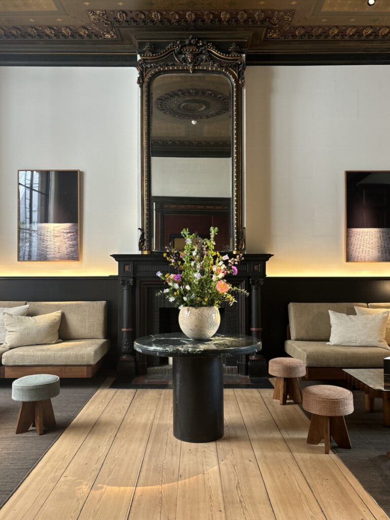 음악에 이끌리듯 중정 쪽으로 걸어 나갔다. 무엇보다 줄리앙의 백미는 이 중정과 맞닿은 라운지다. 호텔 특유의 나직한 소음과 고요가 교차하는 곳이며, 이따금 ‘함께 머물고 있다’라는 연대로 맺어진 다른 투숙객들과 마주침이 허용되는 공간이다. 나처럼 이 호텔을 선택한 다른 누군가와 만나는 것, 때로는 눈인사를 나누거나 몇 마디 가벼운 인사를 주고받게 되는 자리. 라운지에 머무는 시간이 즐겁고 설레는 까닭이다. 느슨하게 놓인 소파 사이로 둥근 테이블과 작은 스툴들이 간격을 둔 채 숨을 고른다. 라운지 한쪽에는 오래된 벽난로가 중심처럼 자리 잡고 있다. 불이 피워지지 않은 날에도 벽난로는 충분히 따뜻하다. 검게 그을린 벽돌과 묵직한 나무 프레임, 거울 속에는 천장의 장식과 꽃이 꽂힌 테이블, 그리고 잠시 멈춰 선 내 모습이 겹친다.